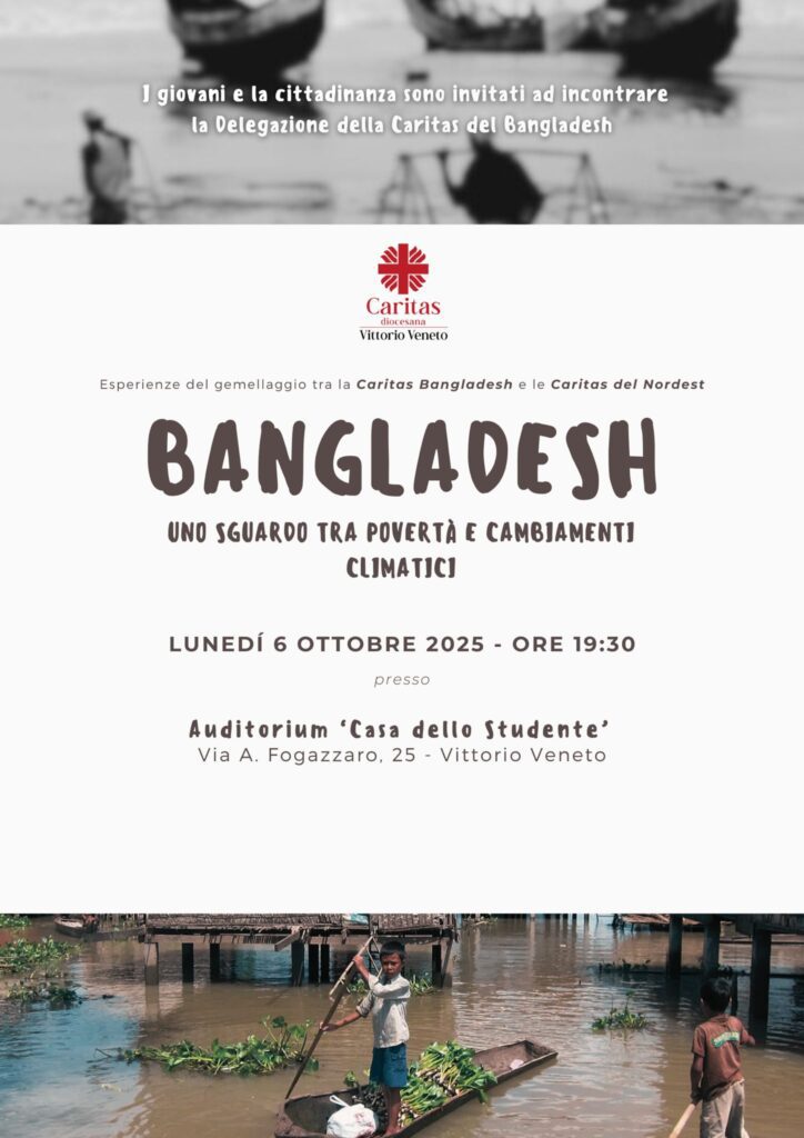 Lunedì 6 ottobre, alle ore 19.30, presso l’Auditorium della Casa dello Studente di Vittorio Veneto, sita in Via A. Fogazzaro 25, si terrà l’incontro dal titolo “Bangladesh. Uno sguardo tra povertà e cambiamenti climatici”.